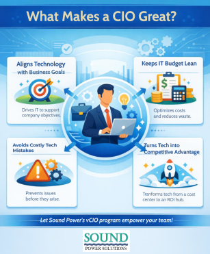 CIOs go beyond tech talk and fancy suites. They shape how tech empowers your team. Discover what a CIO offers your business and contact Sound Power Solutions’ #vCIO team to see how we transform tech overhead into a strategic advantage.